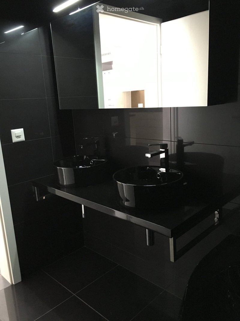 Salle de douche/WC noirs, comprenant jacuzzi d'angle, cabine de douche en alu et verre, portes serviettes chauffants et meubles