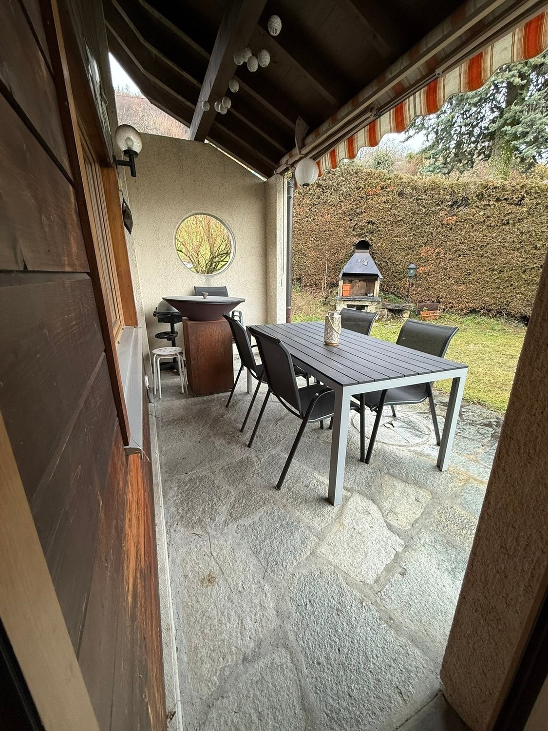 Une entrée avec armoires murales, un wc visiteurs, une cuisine entièrement agencée ouverte sur un coin à manger et accès sur la terrasse, un salon avec une cheminée, à l'étage quatre chambres et une salle de douche/wc, une terrasse couverte et un jardin avec un barbecue. Une cave.