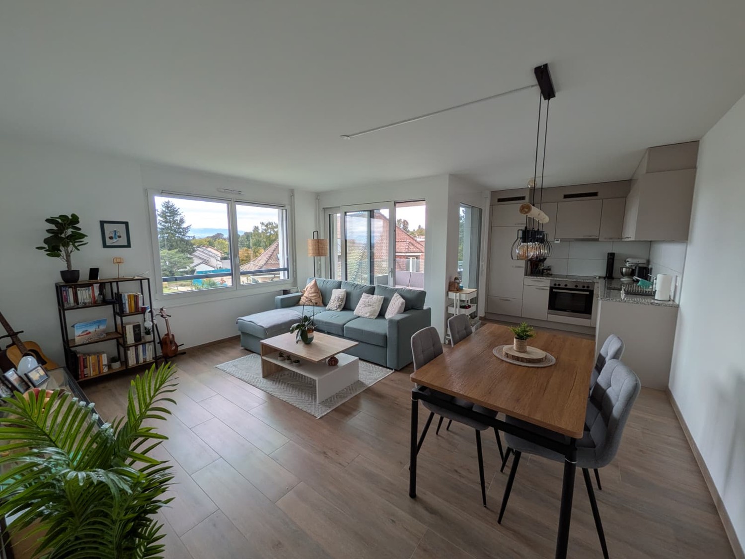 une cuisine ouverte sur le salon donnant accès à un balcon orienté vers le Jura,