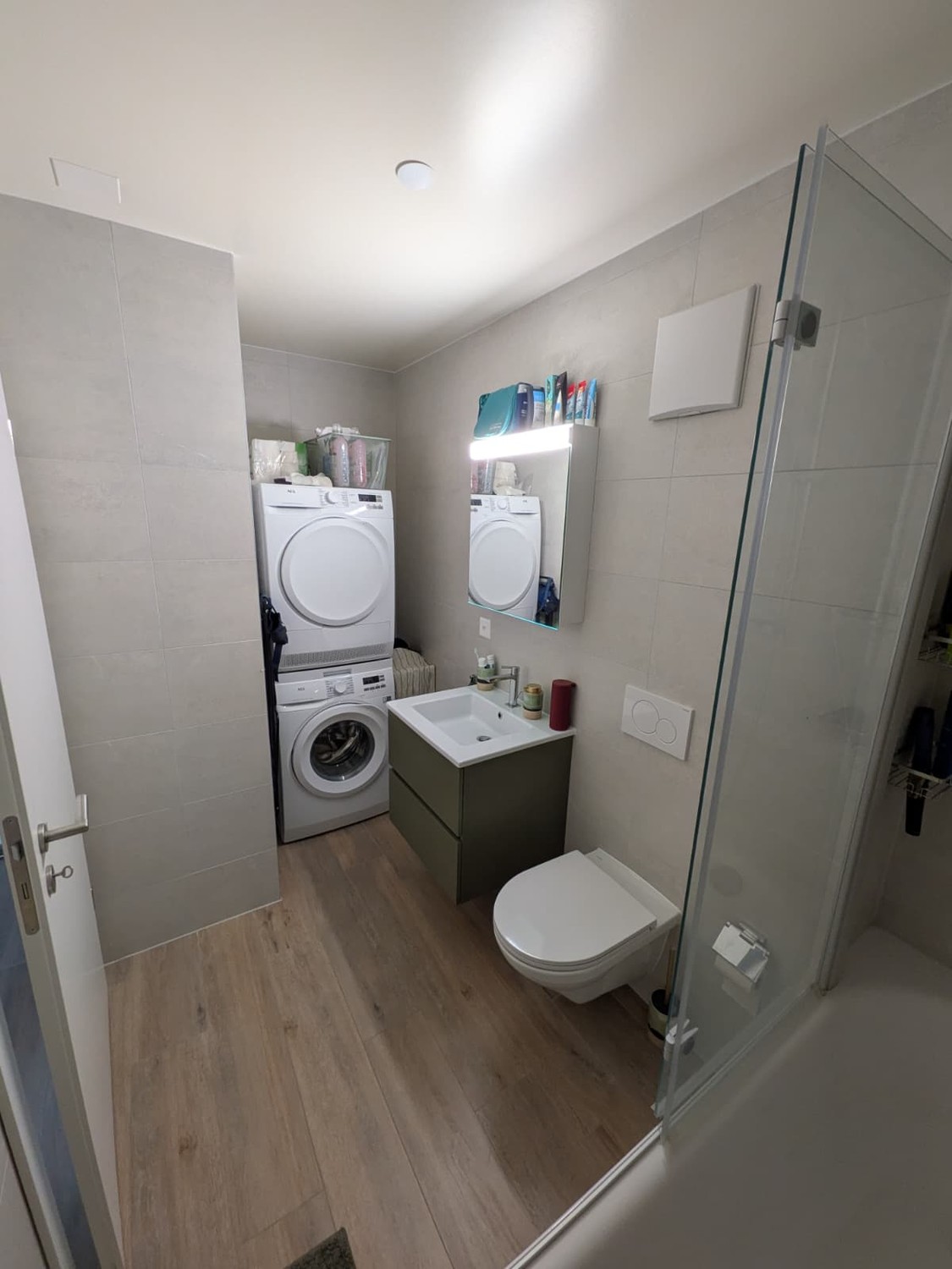 une salle de bain moderne équipée d un lave-linge et d un sèche-linge.