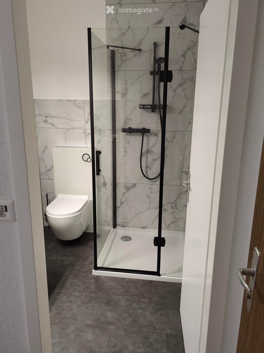 Salle de bain moderne : Équipée d'une douche carrelée avec parois en verre, toilettes blanches et finitions élégantes