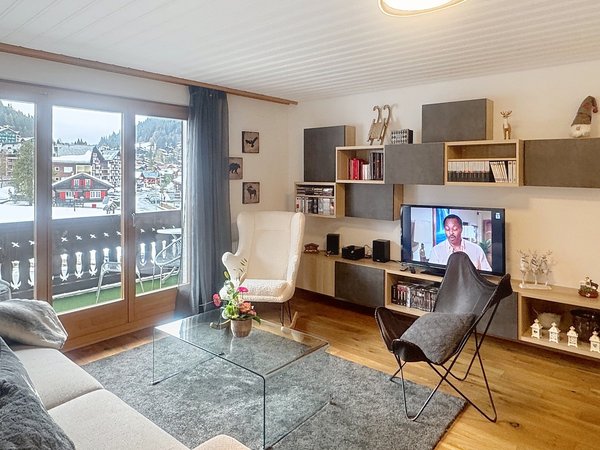 Salon spacieux : Un espace de vie lumineux avec accès au balcon offrant une vue imprenable sur la montagne et les paysages environnants