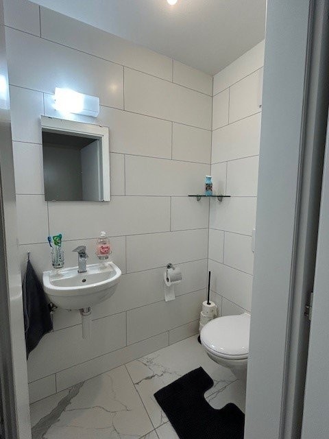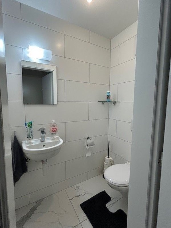 Cuisine ouverte et moderne avec carrelage blanc et colonne de lavage