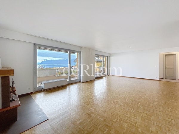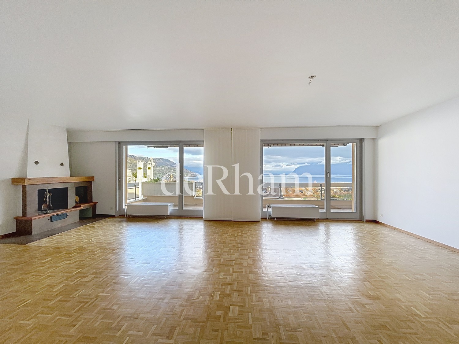 - Vaste séjour lumineux avec cheminée et accès balcon, offrant une vue imprenable sur le lac, les vignes et les montagnes