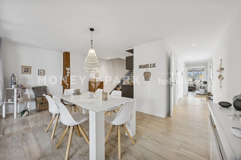 Le premier étage présente une organisation harmonieuse entre les espaces de vie. Le salon bénéficie d'une bonne luminosité et d'un agencement confortable, tandis que la salle à manger est située à l'opposé. La cuisine, aménagée et équipée, se situe entre les deux, le long du couloir. Un dégagement ainsi qu'un WC visiteurs séparé complètent ce niveau.