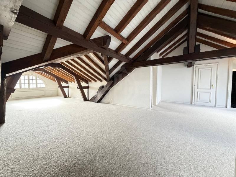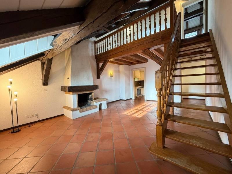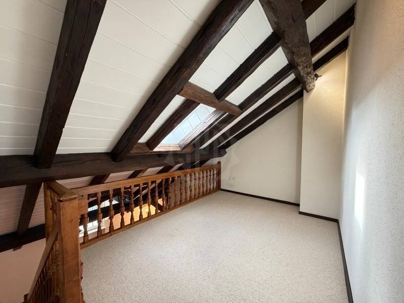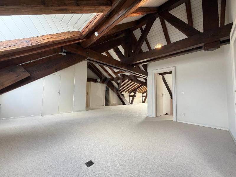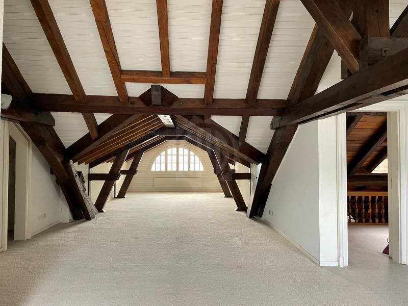 Sur deux niveaux avec deux entrées, une à chaque étage se répartissent au niveau supérieur un loft d?une surface d?un seul tenant d?environ 100 m2. Pour l?éclairage, deux grands velux côté Jura et un oeil de b?uf géant côté lac avec une vue dégagée. Un local toilettes avec lavabo et deux dressings. De belles poutres anciennes soutenant la toiture haute sont apparentes.