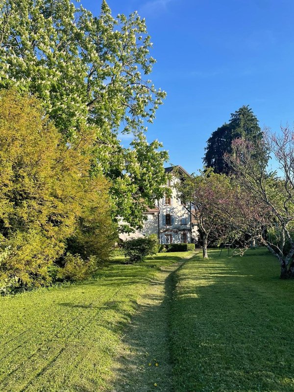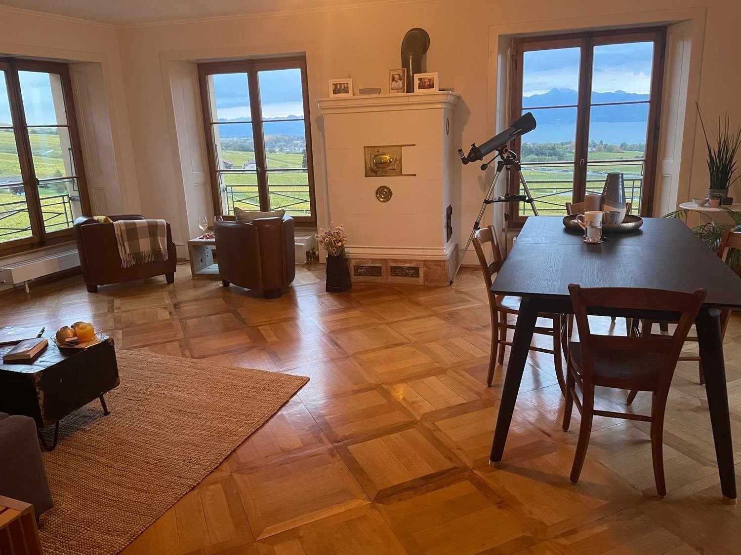 Vue à 180 degrés sur le Léman depuis les grandes fenêtres du salon, magnifique parquet et poêle d'époque.