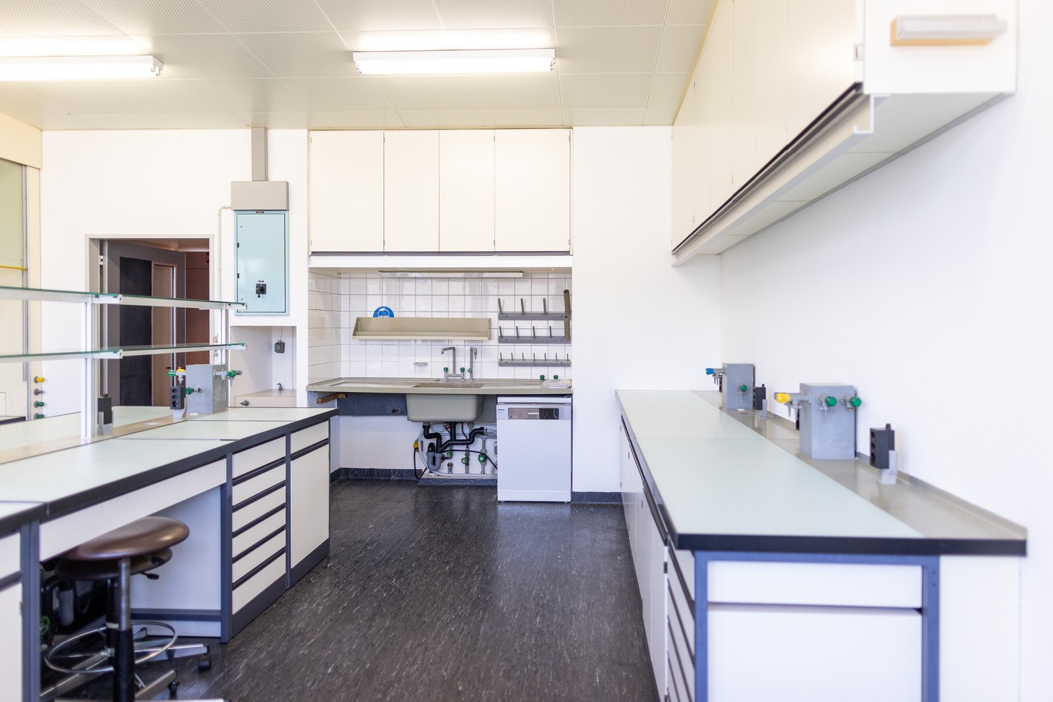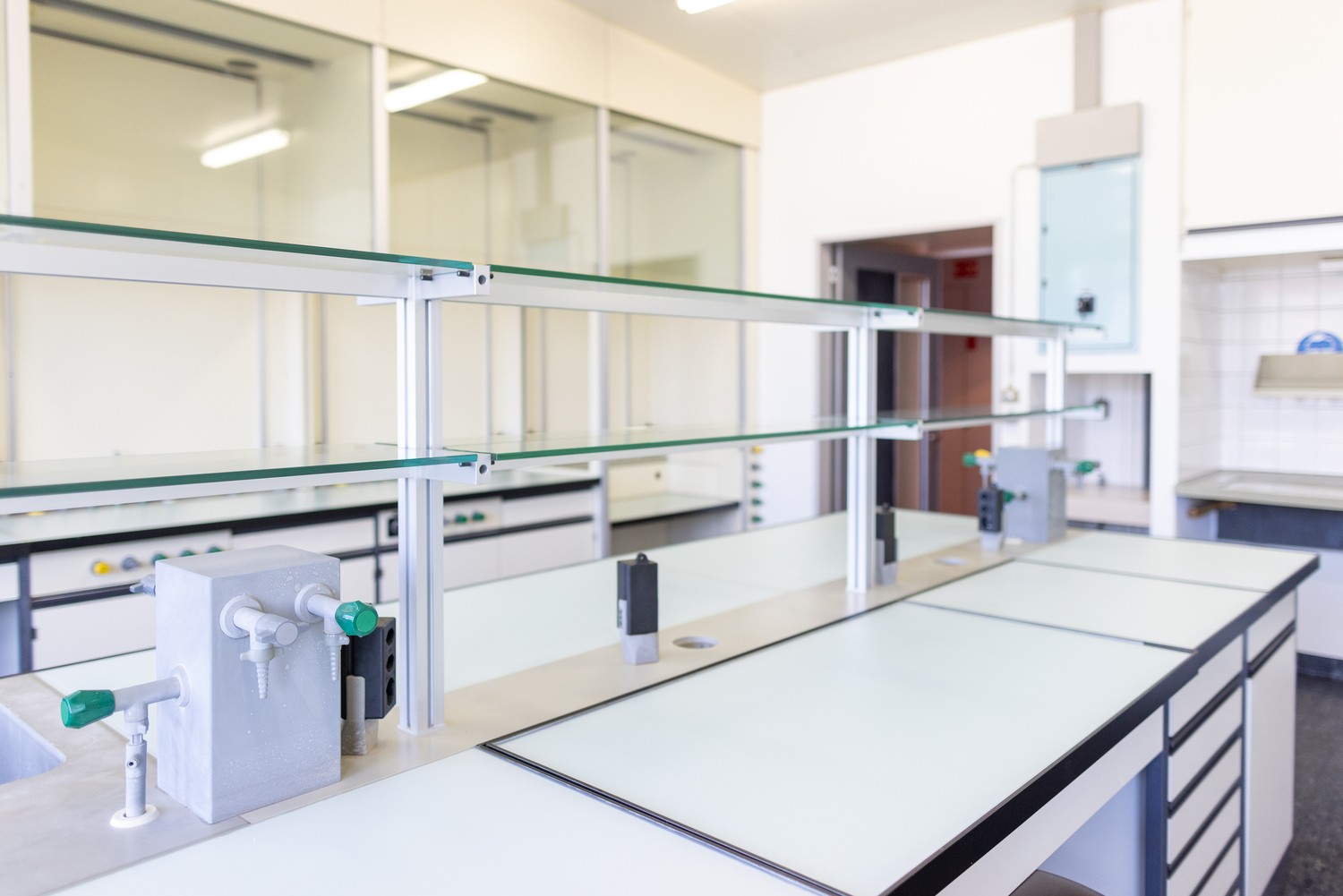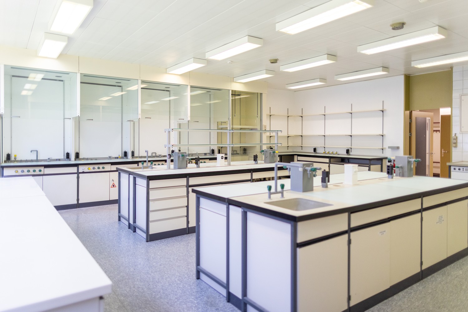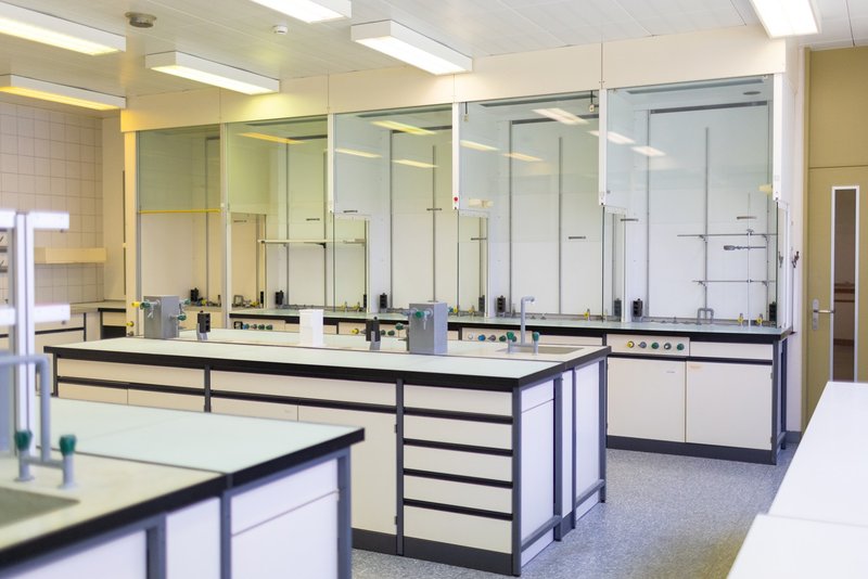 Nos laboratoires (20m2 ,40m2, 72m2) sont en principe équipés de chapelle(s) d'extraction, de plans de travail (paillasse) avec arrivées de gaz, d'eau, azote, eau déminéralisée, vacuum, et d'électricité (230V, 400V), et de nombreux espaces de rangements.