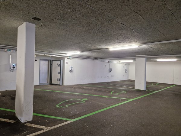Großer Kundenparkplatz mit Ladestationen für Elektrofahrzeuge