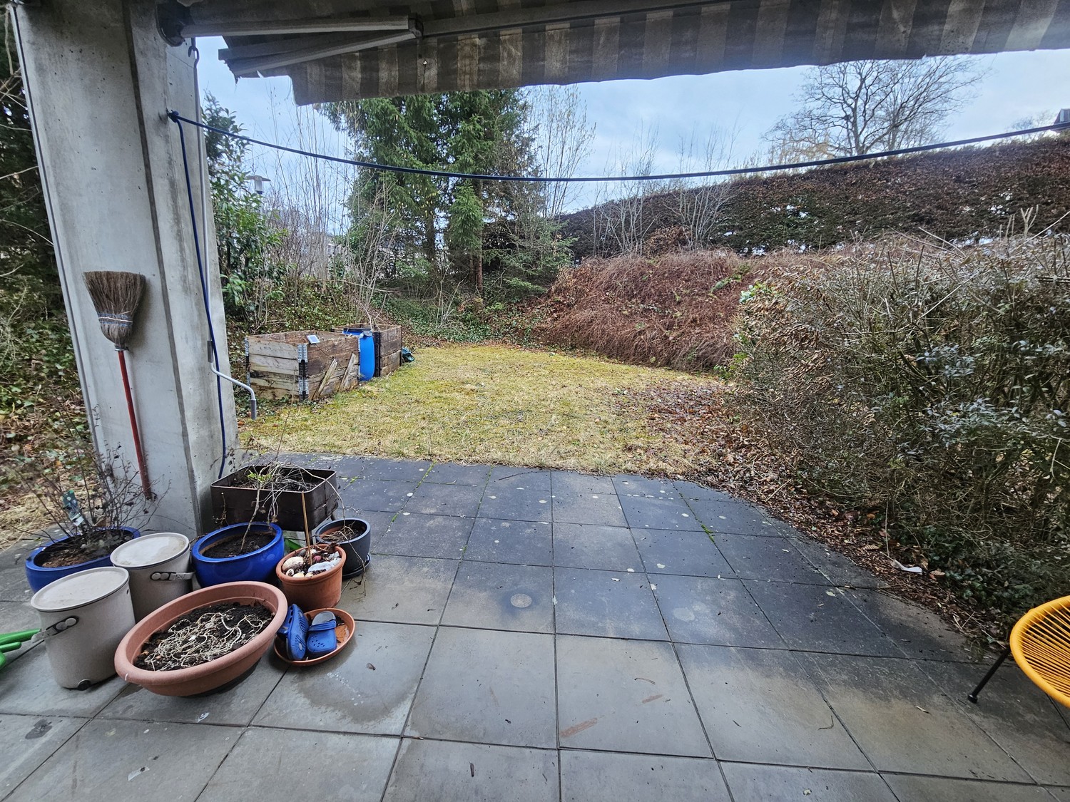 Le séjour spacieux offre beaucoup de place pour vivre et se détendre. Un atout particulier est la terrasse avec une petite surface de pelouse, idéale pour profiter, jardiner ou passer des moments agréables à l’extérieur.