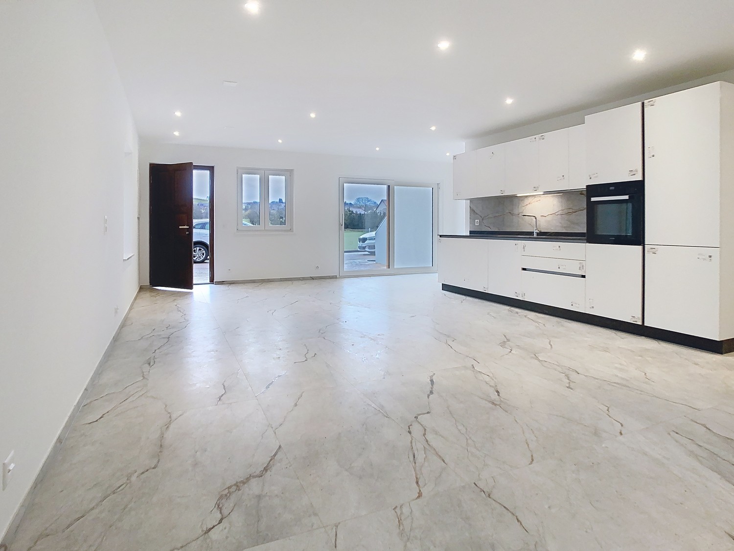 Magnifique séjour / salle à manger baigné de lumière naturelle, sublimé par un élégant carrelage