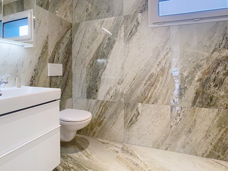 Confort optimal avec double équipement sanitaire (douche italienne au rez et baignoire + douche à l’étage)