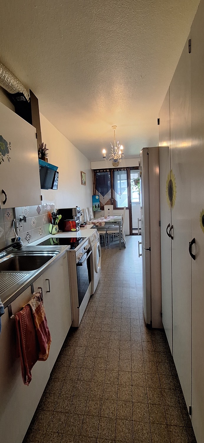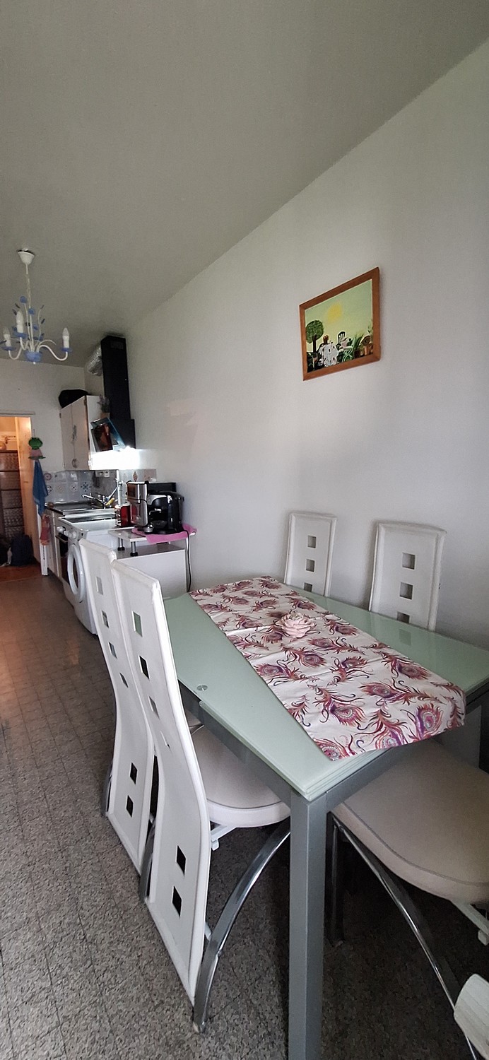 Salon, cuisine équipée, salle de bains et WC à disposition.