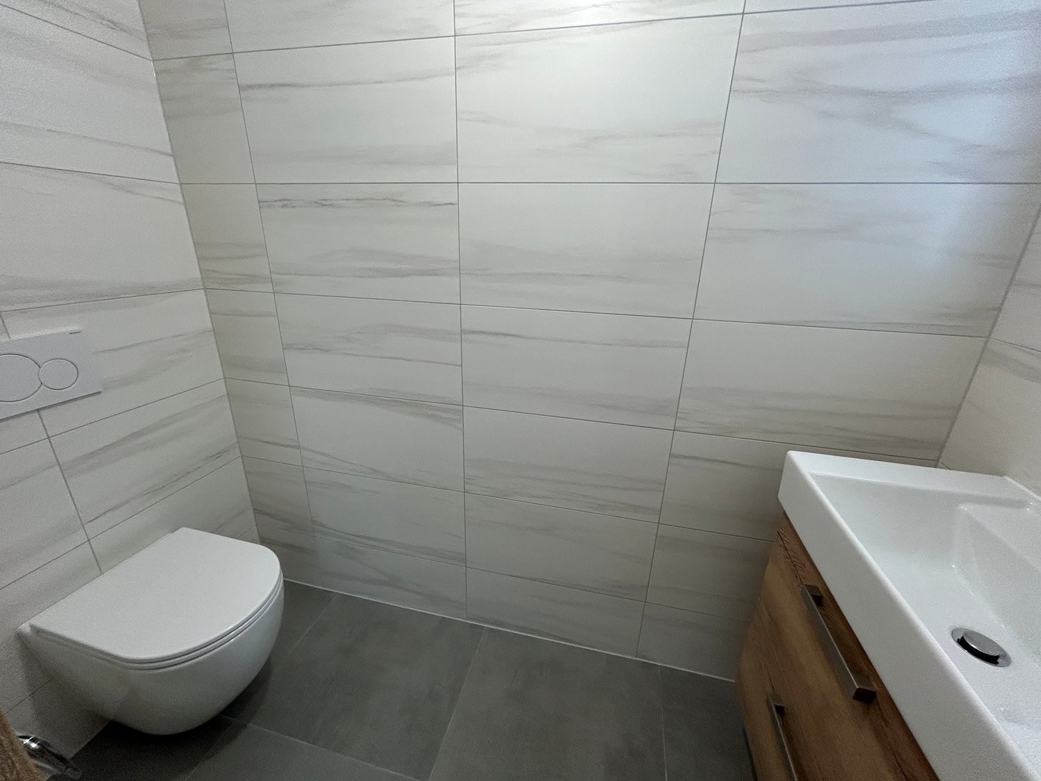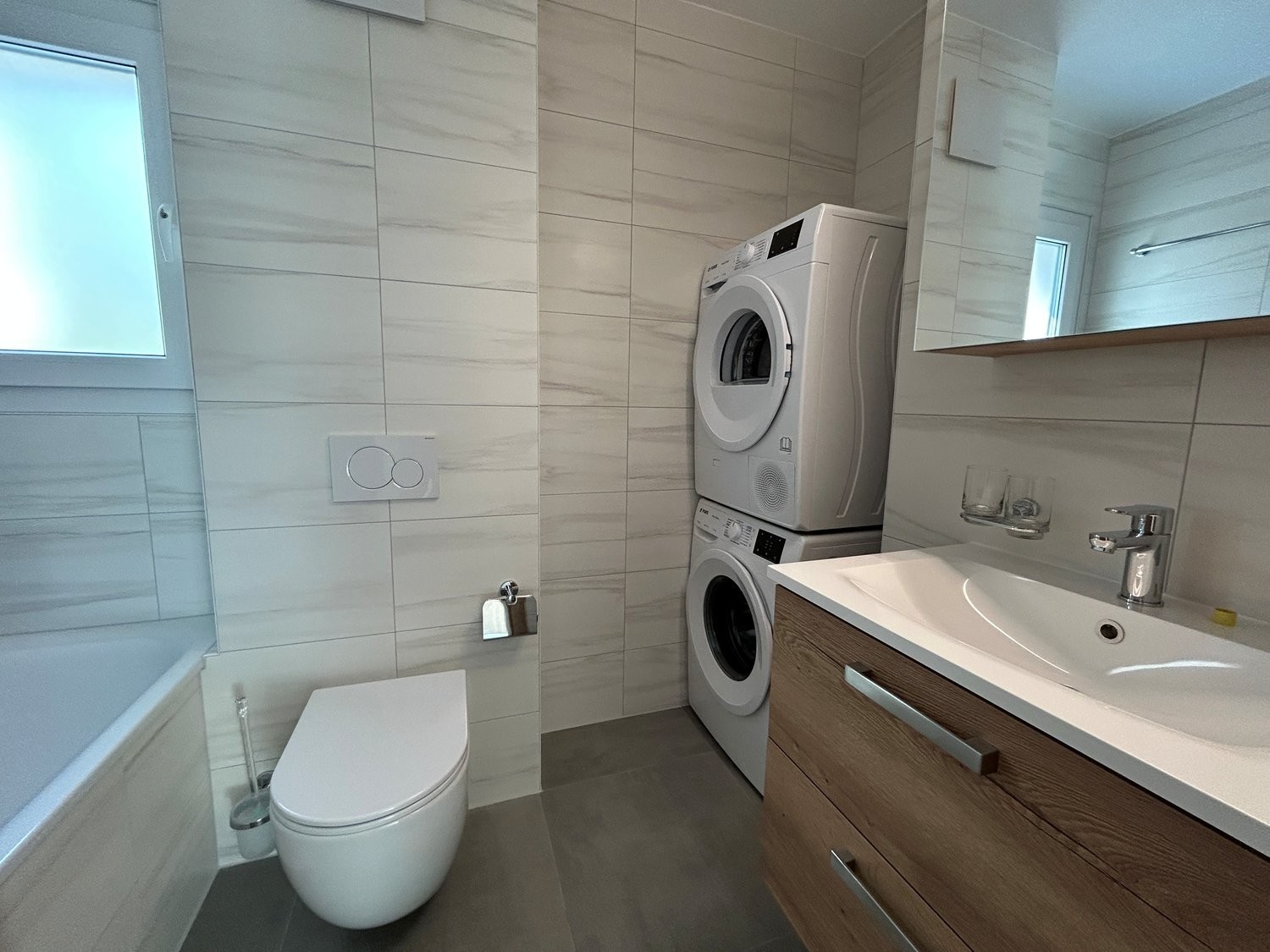 Appartement neuf au 1er étage comprenant une cuisine agencée ouverte sur le séjour, 3 chambres, une salle de bain avec baignoire/WC avec colonne de lavage, un wc séparé, un balcon.