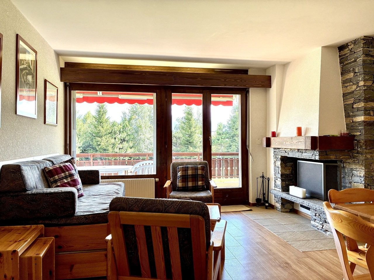 1 living- salle à manger sud avec canapé-lit gigogne, cheminée, TV, lecteur DVD et balcon