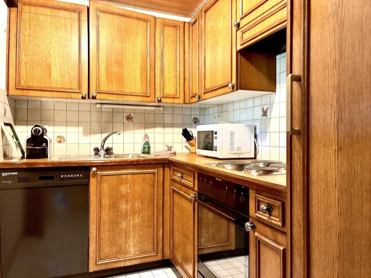1 petite cuisine avec plaques électriques, four, réfrigérateur avec petite partie congélation, lave-vaisselle, micro-ondes et fenêtre donnant sur le living