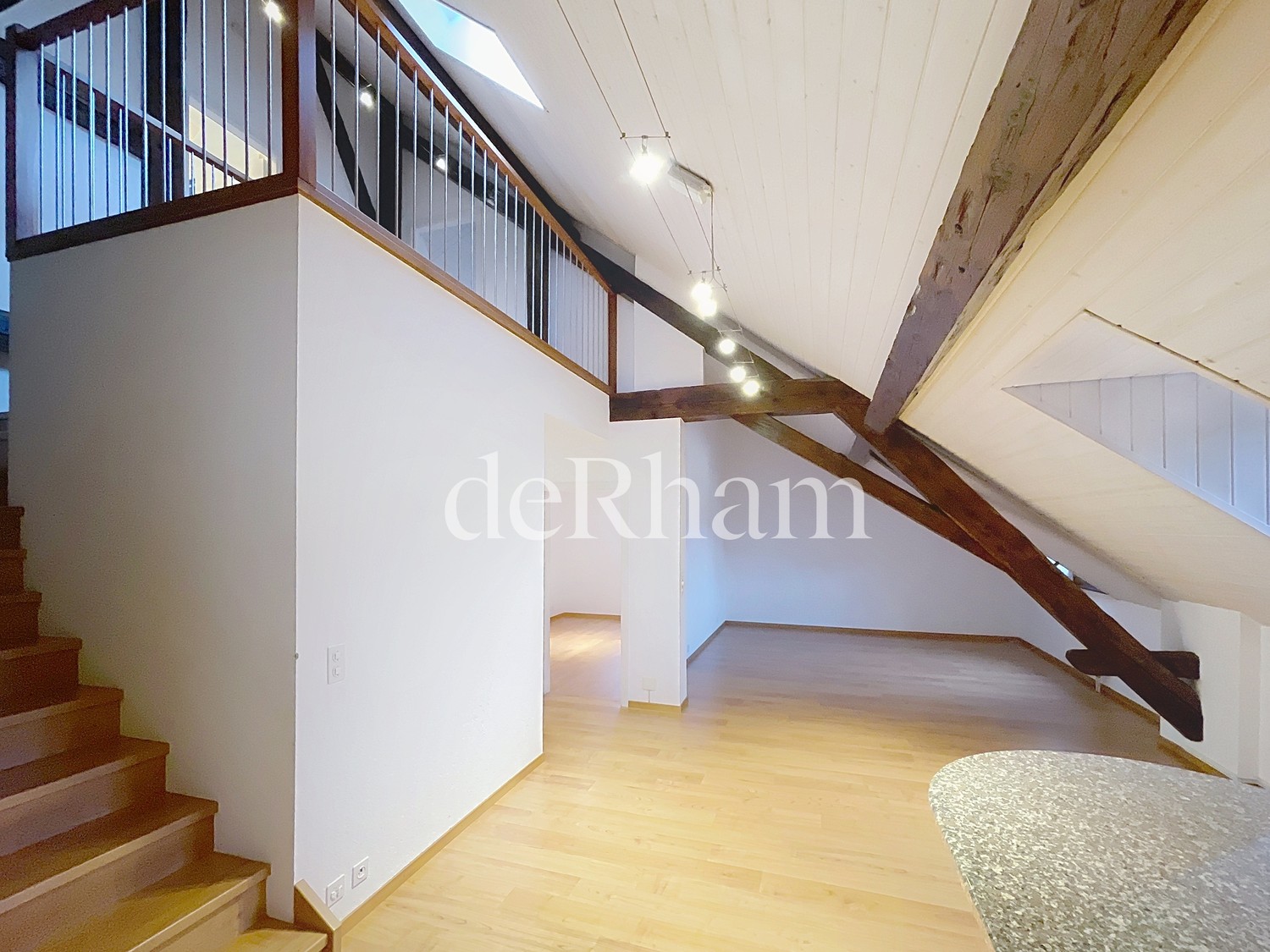 Ce bel appartement mansardé de 4,5 pièces, d'environ 115 m² habitables, séduit par ses poutres apparentes et ses encadrements en molasse, qui lui confèrent un cachet indéniable.