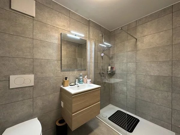 Hall d'entrée avec armoires murales, deux chambres, une salle de bains avec baignoire et raccordement pour une colonne de lavage (non fournie), séjour, cuisine agencée ouverte sur le séjour, une chambre parentale avec armoire murale, une salle de douche avec wc attenante à la chambre.