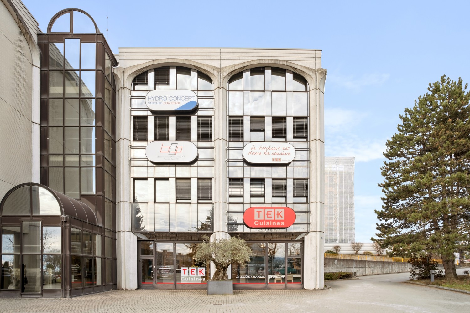 Situé à côté de la zone industrielle de Crissier, l'immeuble regroupe plusieurs grandes enseignes telles que SABAG, HydroConcept et TekCuisine, reconnues dans la région.