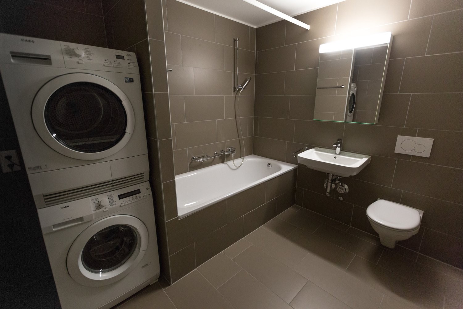 Il dispose également de deux chambres dont une avec WC/douche, ainsi que d'une salle de bains avec baignoire équipée de la colonne de lavage.