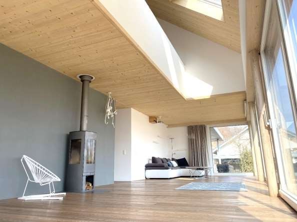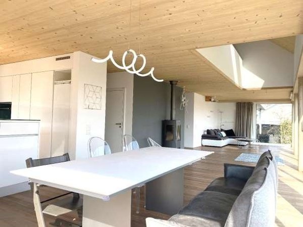 Besondere Ausstattung: Die Villa verfügt über einen wunderschönen Holzbau, komplett unterkellert, Zugang von Aussen zu Hobby, Sportraum und einem zusätzlichen mit Naturkeller. 3 Parkplätze unter dem Carport. Das 759 m² grosse Grundstück bietet viel Platz für Kinder zum Spielen und ist von der ruhigen, direkt an den Wald anschliessenden Umgebung geprägt.