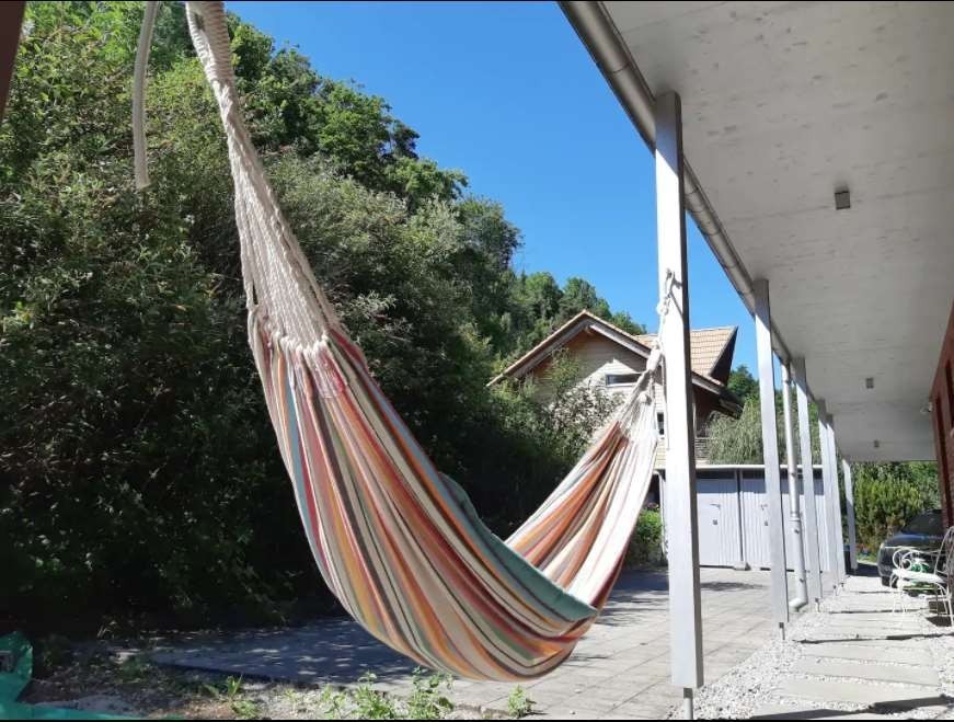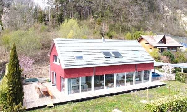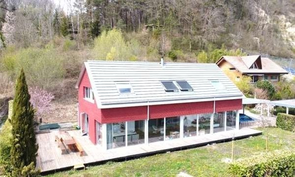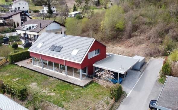 Entdecken Sie diese aussergewöhnliche, freistehende 7.5-Zimmer-Villa aus dem Jahr 2006, die 2024 teilweise renoviert wurde und sich in idyllischer Lage in Vallamand am Hafen befindet. Das moderne und absolut ökologische, chemiefreie Einfamilienhaus mit seiner charakteristischen roten Holzfassade und den grossen Glasfenstern bietet auf 225 m² Wohnfläche höchsten Wohnkomfort für die ganze Familie oder Menschen mit Ruhe und Platzbedürfnissen. Das Haus verfügt über drei Eingänge; einen Büroraumzugang, den Haupteingang und eine Schmutzschleuse.