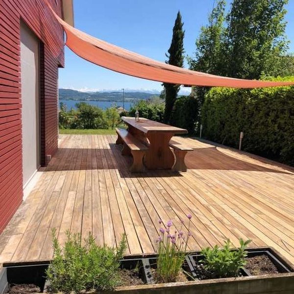 Herrliche Terrasse: Holzdeck mit Sitzgelegenheiten und traumhaftem Blick auf den Murtensee