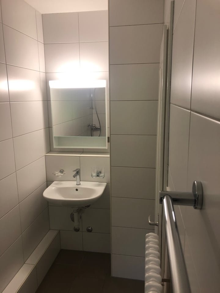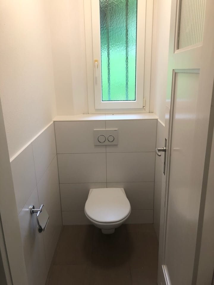 Salle de bains complète : Carrelée avec douche, fenêtre et tout le confort nécessaire.
