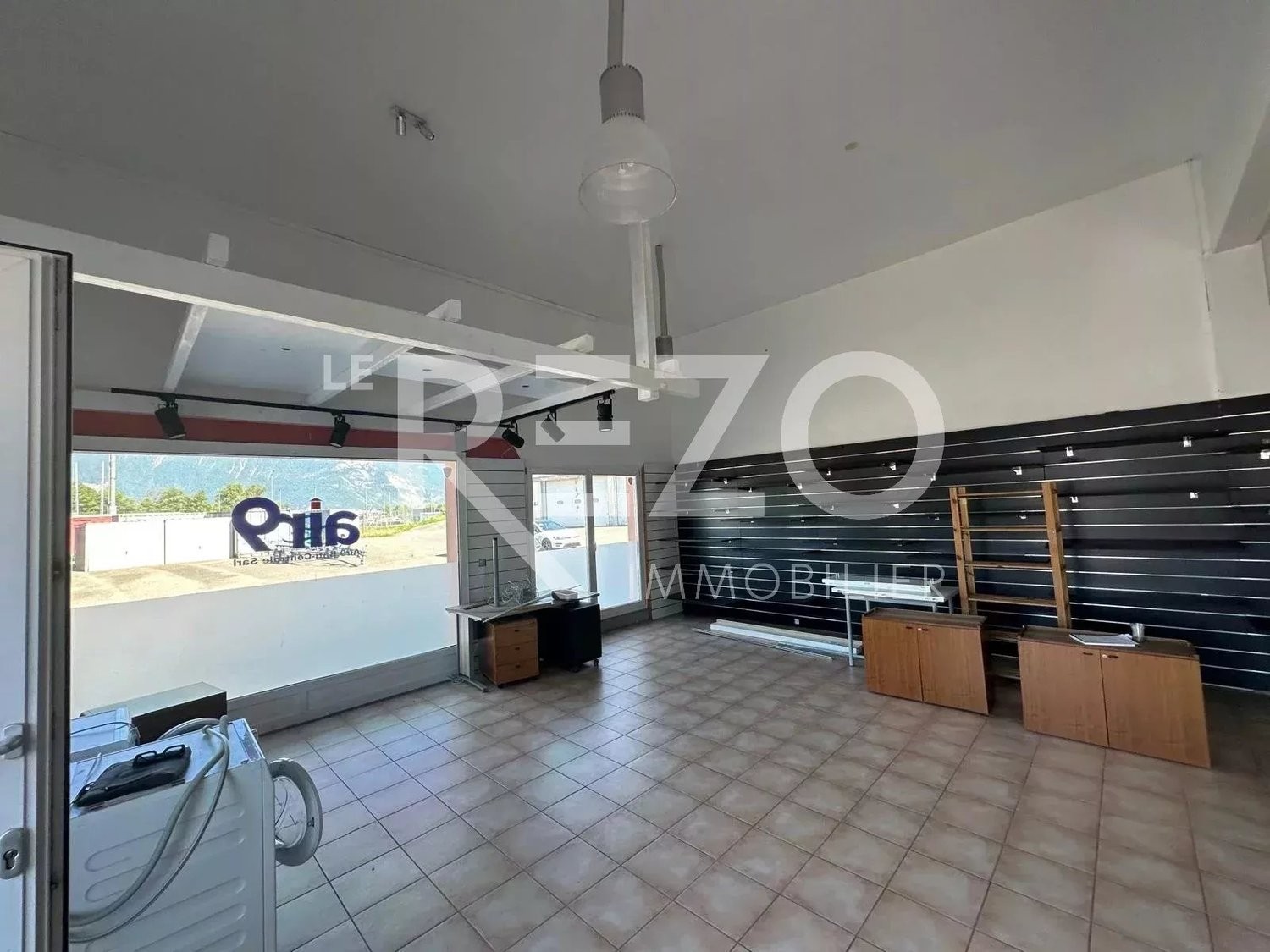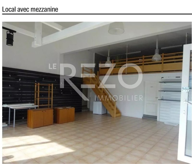 Local commercial lumineux avec grande vitrine, mezzanine, bureau, kitchenette, WC et douche.