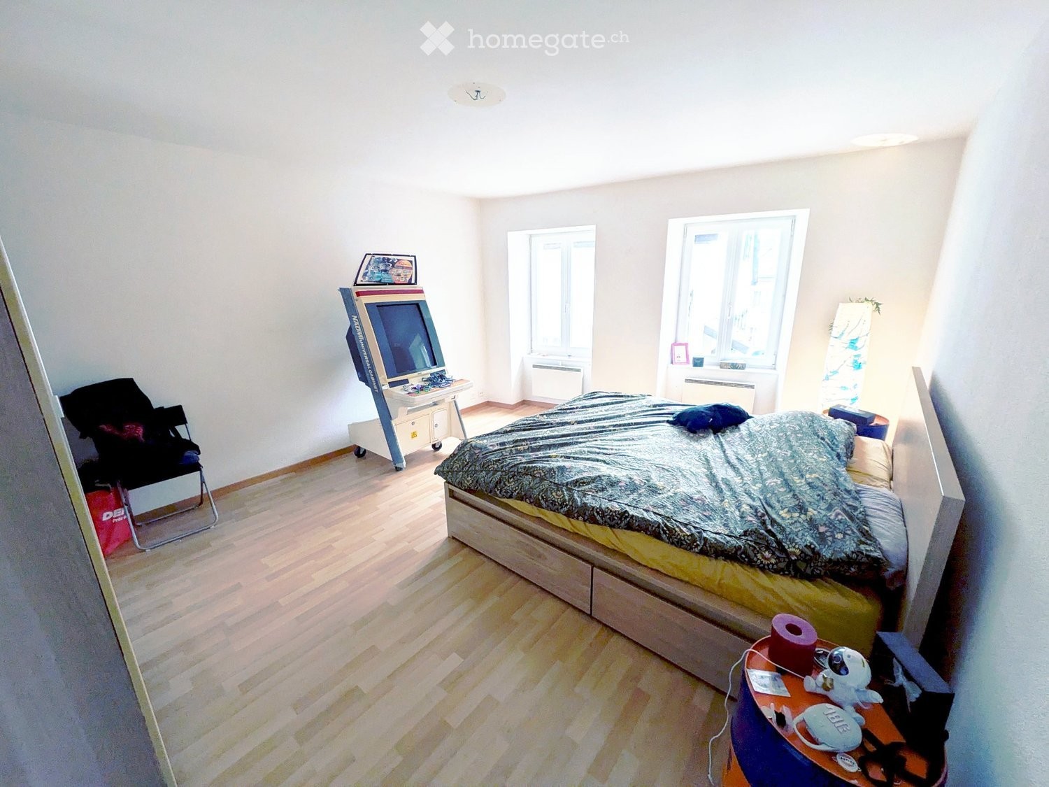 Chambre spacieuse : Avec sol stratifié, murs blancs et grande fenêtre apportant une belle lumière naturelle.