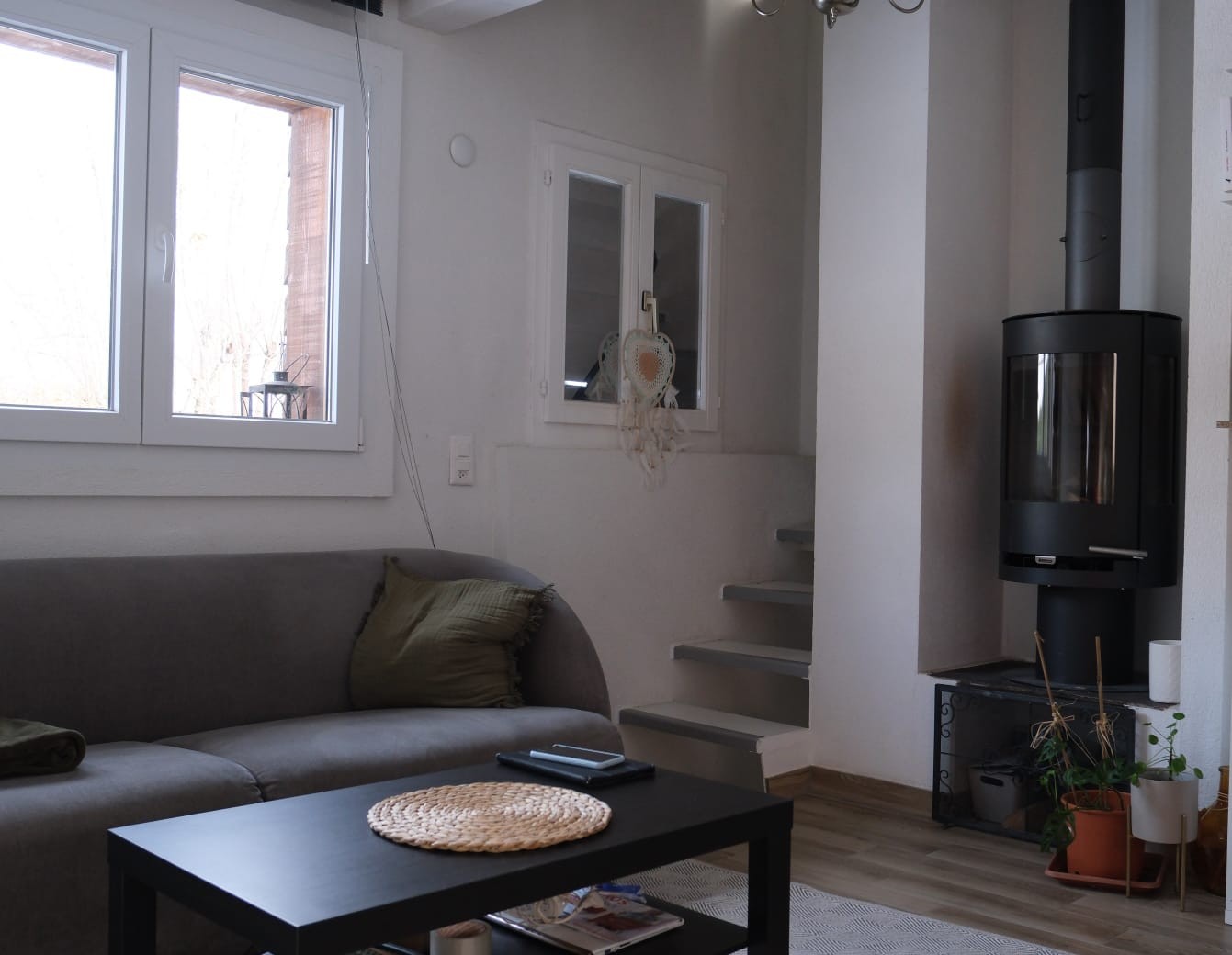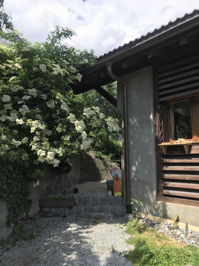 Ancienne grange rénovée en habitation individuelle, maison lumineuse et cosy, avec jardin et place de parc à Veyras en Valais.