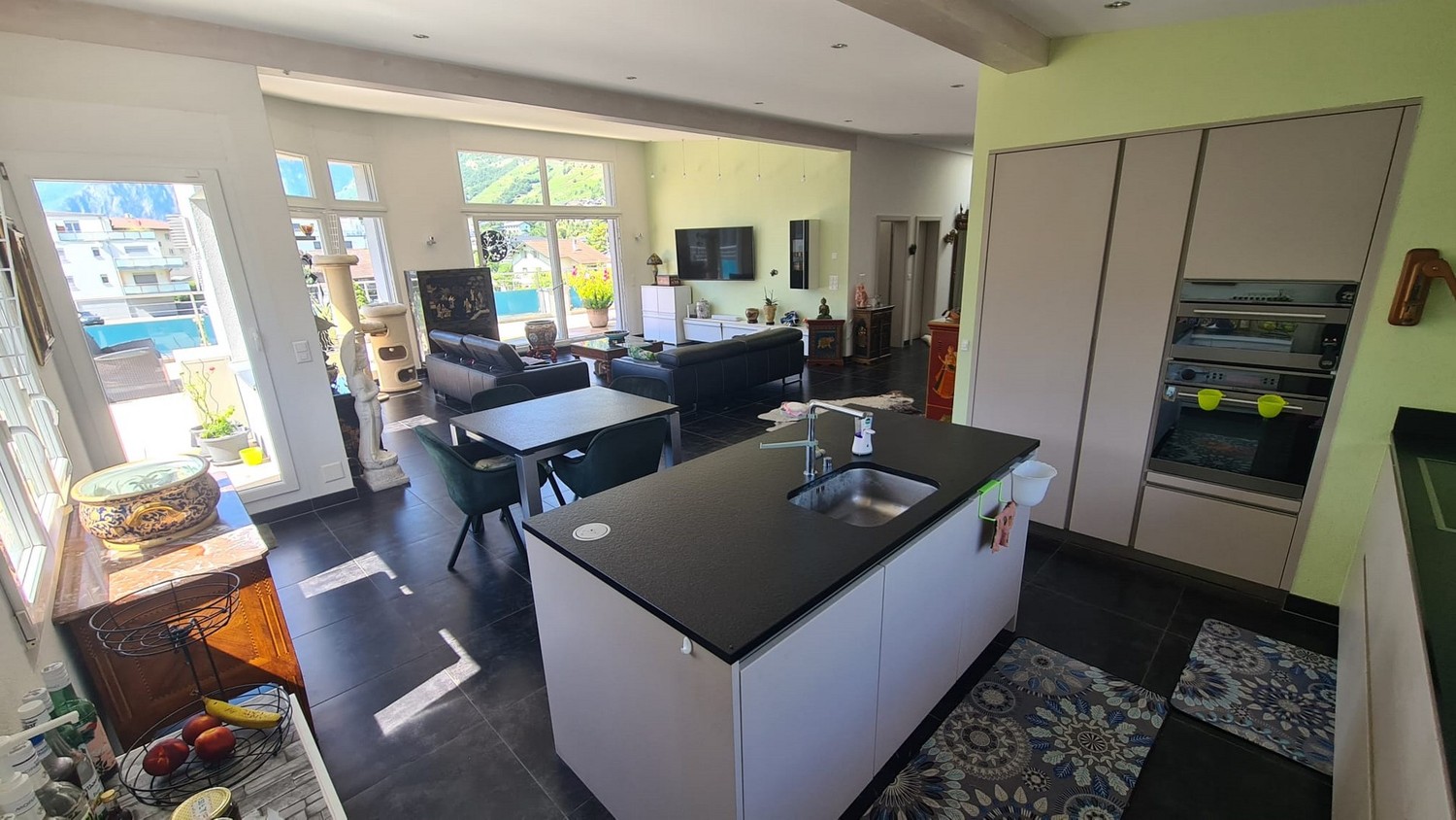 cuisine moderne avec îlot central ouverte sur salle à manger et salon, ensoleillement du matin au soir !