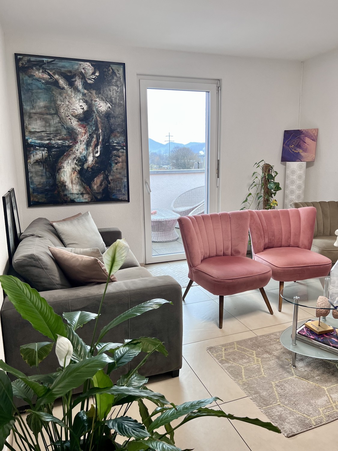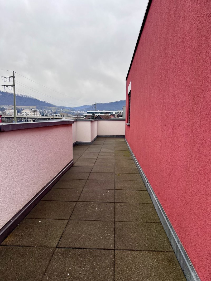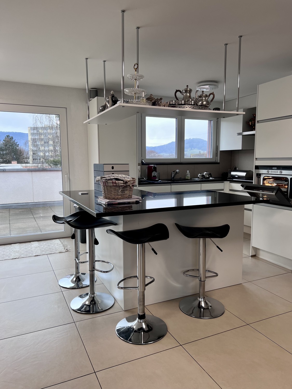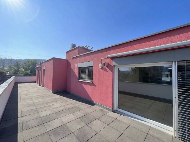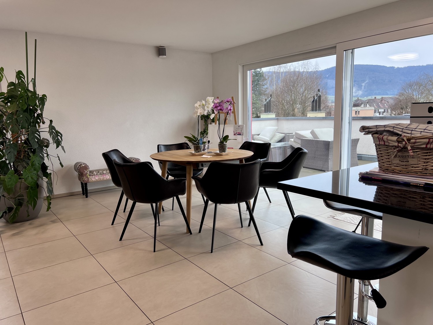 La terrasse entoure l’appartement et offre une vue panoramique sur Delémont et ses espaces verts, idéale pour se détendre ou recevoir des invités. Les grandes fenêtres baignent les pièces de lumière naturelle, et des stores électriques assurent confort et fraîcheur en été.