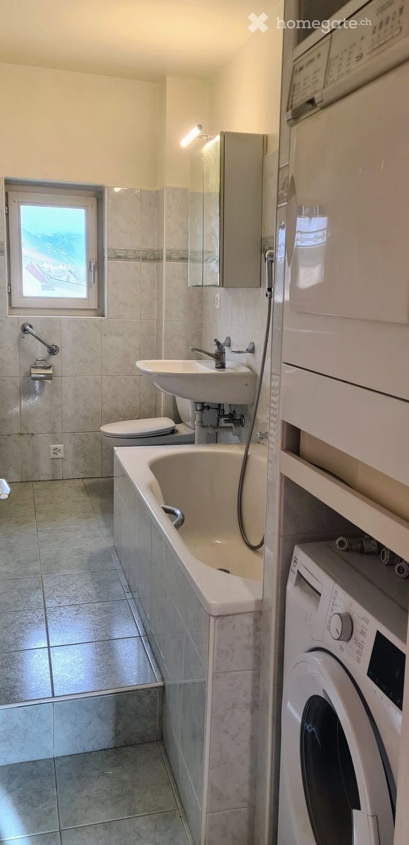 Salle de bain : baignoire, sécheuse et lave-linge