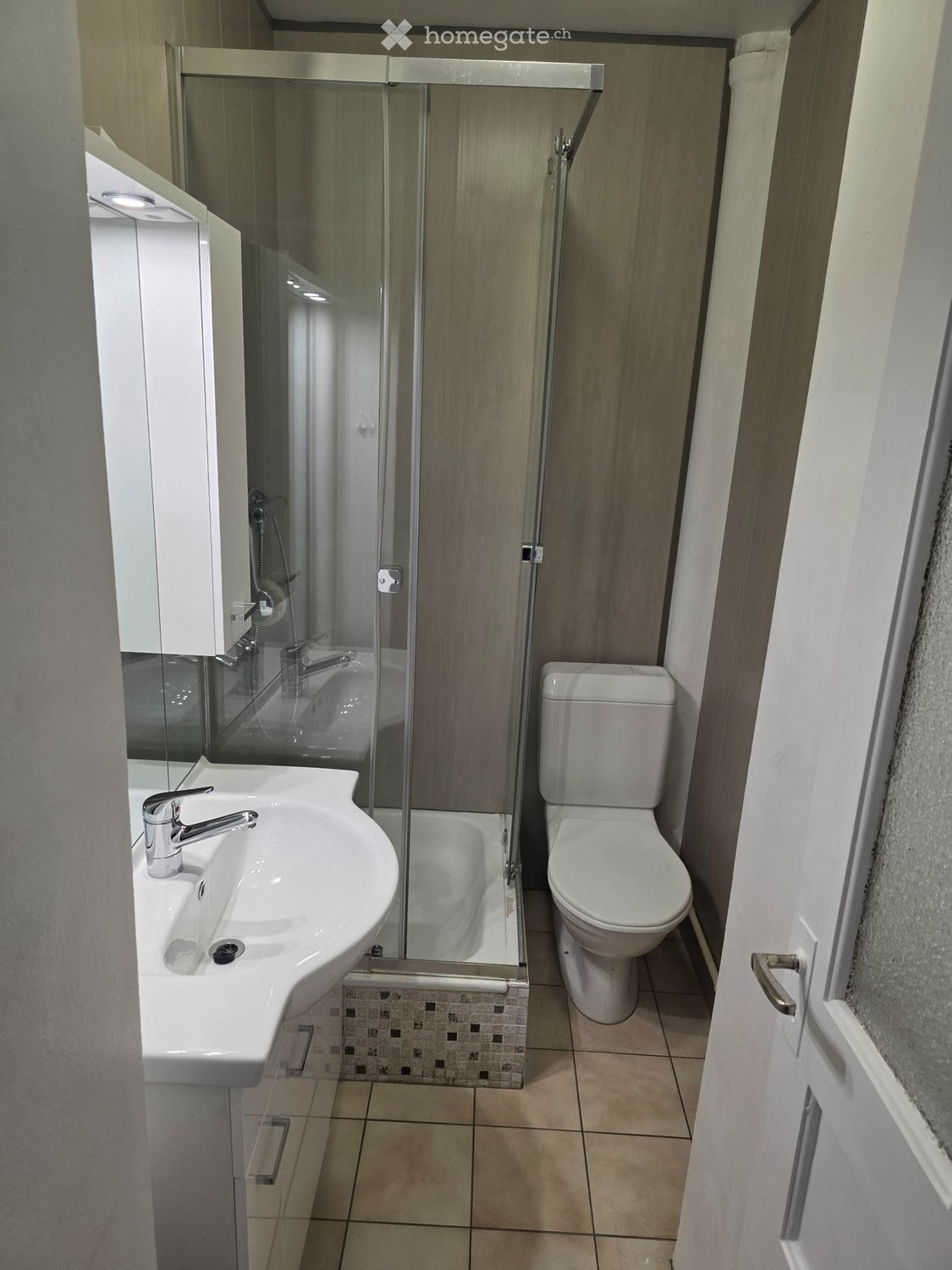 - Salle de bain pratique avec douche vitrée et rangements intégrés