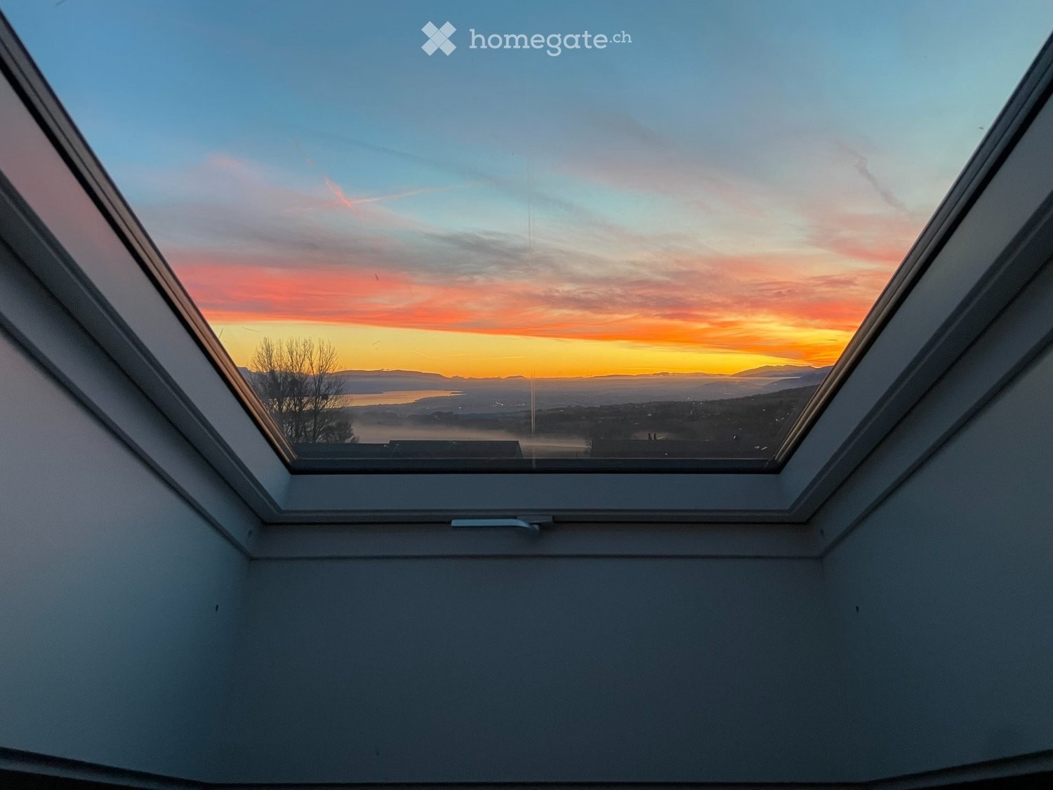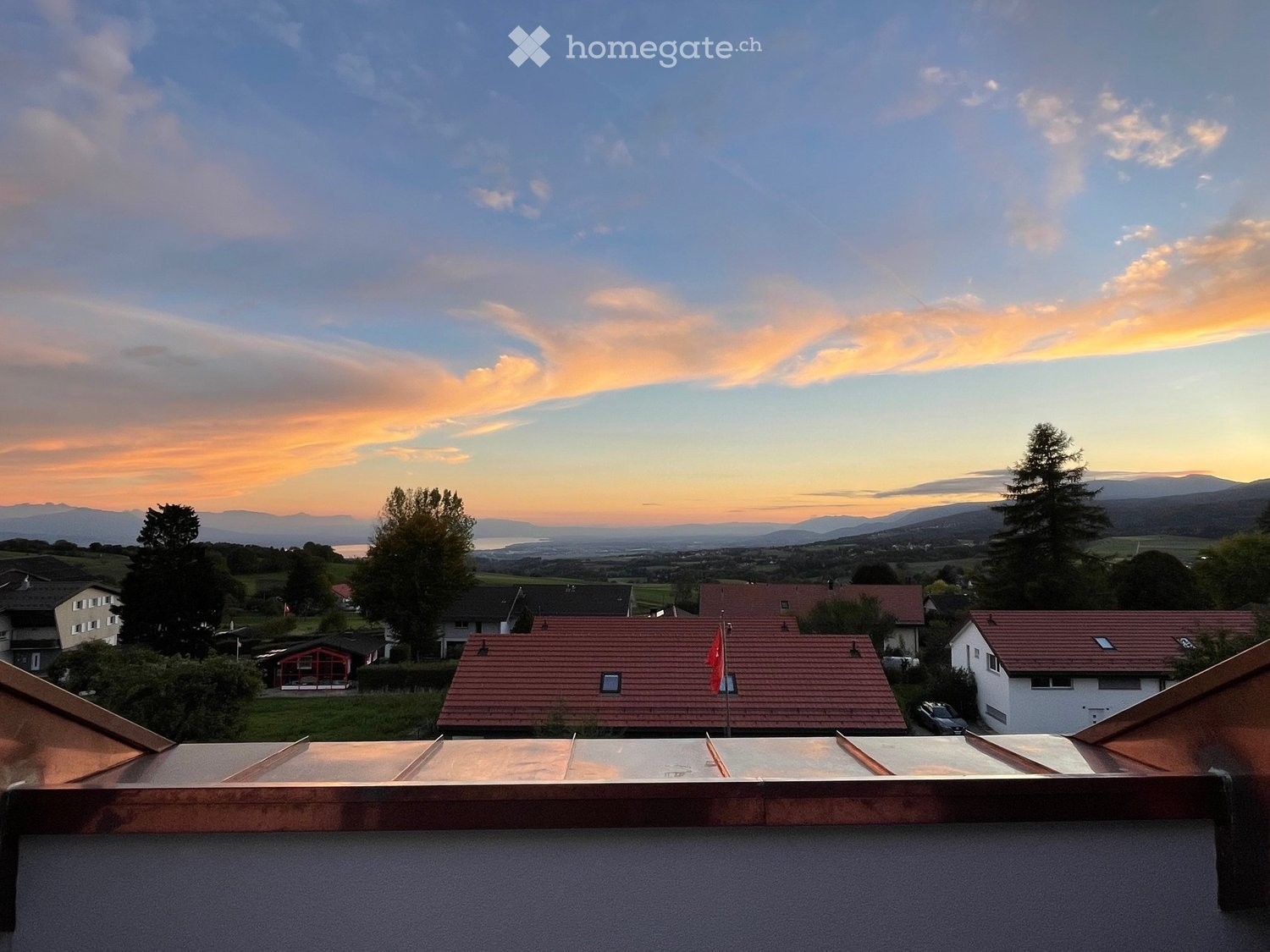 Un balcon baignoire d'environ 9.5 m2 côté sud avec vue imprenable sur le Jura, les Alpes et le bassin lémanique.