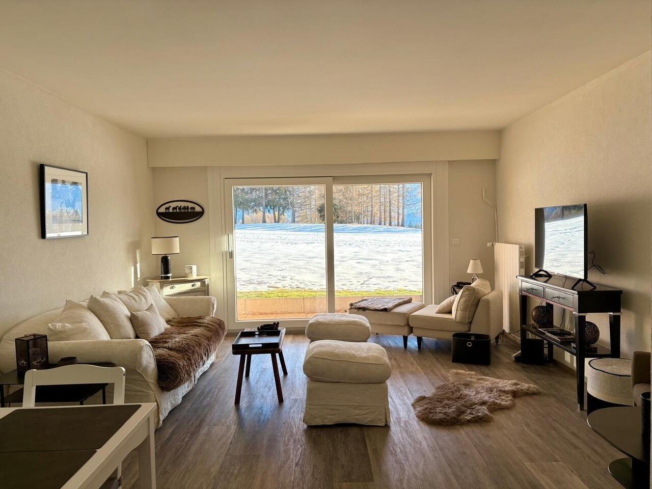 Located in the heart of the famous Ballesteros Golf Course , just a 10-minute walk from the center of Crans and facing the 9th hole, this apartment, completely renovated in 2021, enjoys a privileged location in a quiet residential neighborhood.