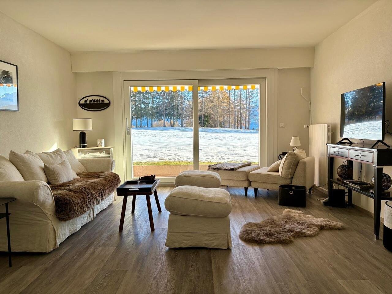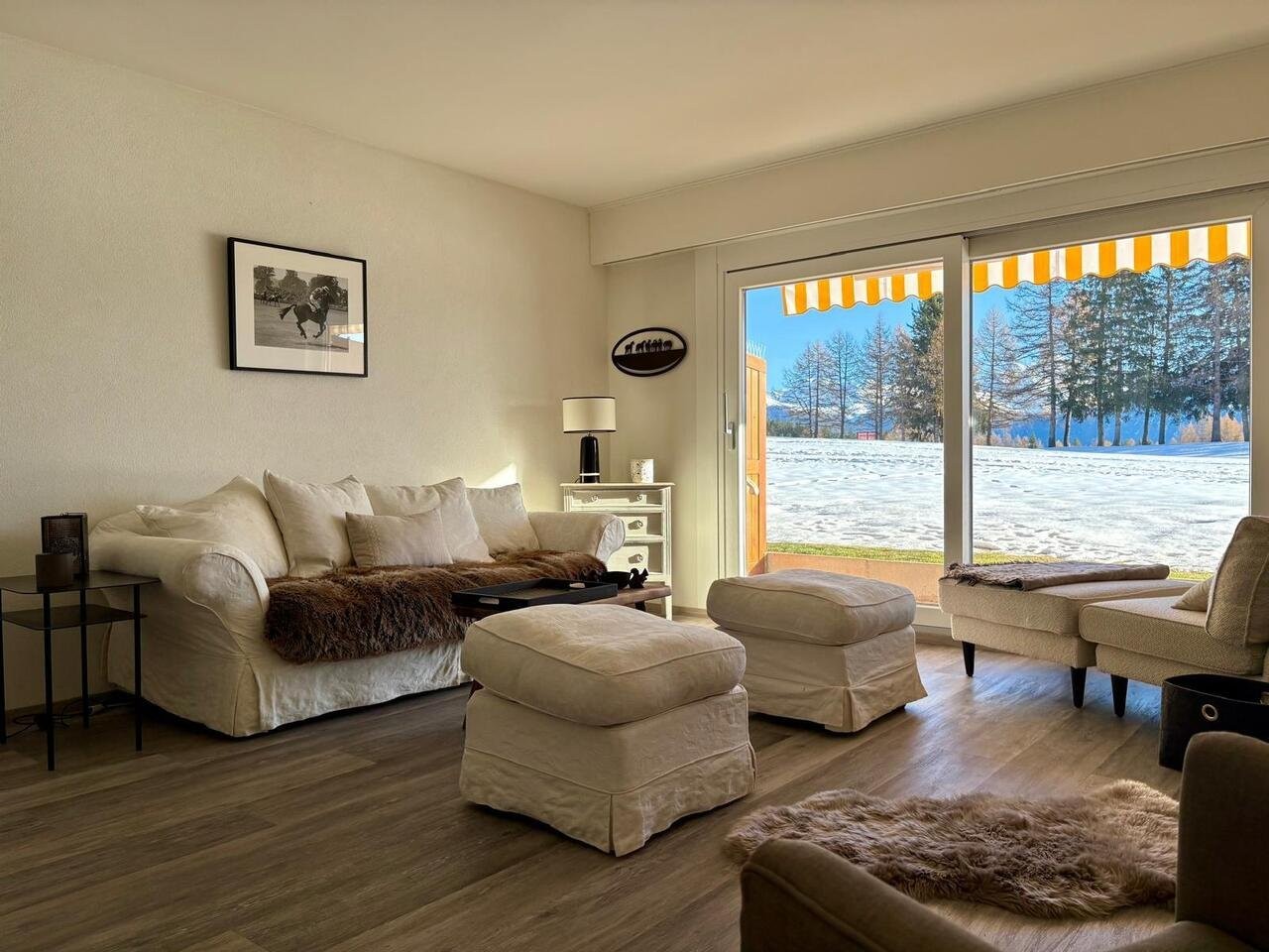 L'appartement offre un accès direct au jardin orienté plein sud , baigné de lumière tout au long de la journée, avec une vue panoramique incomparable sur le golf et les montagnes valaisannes.