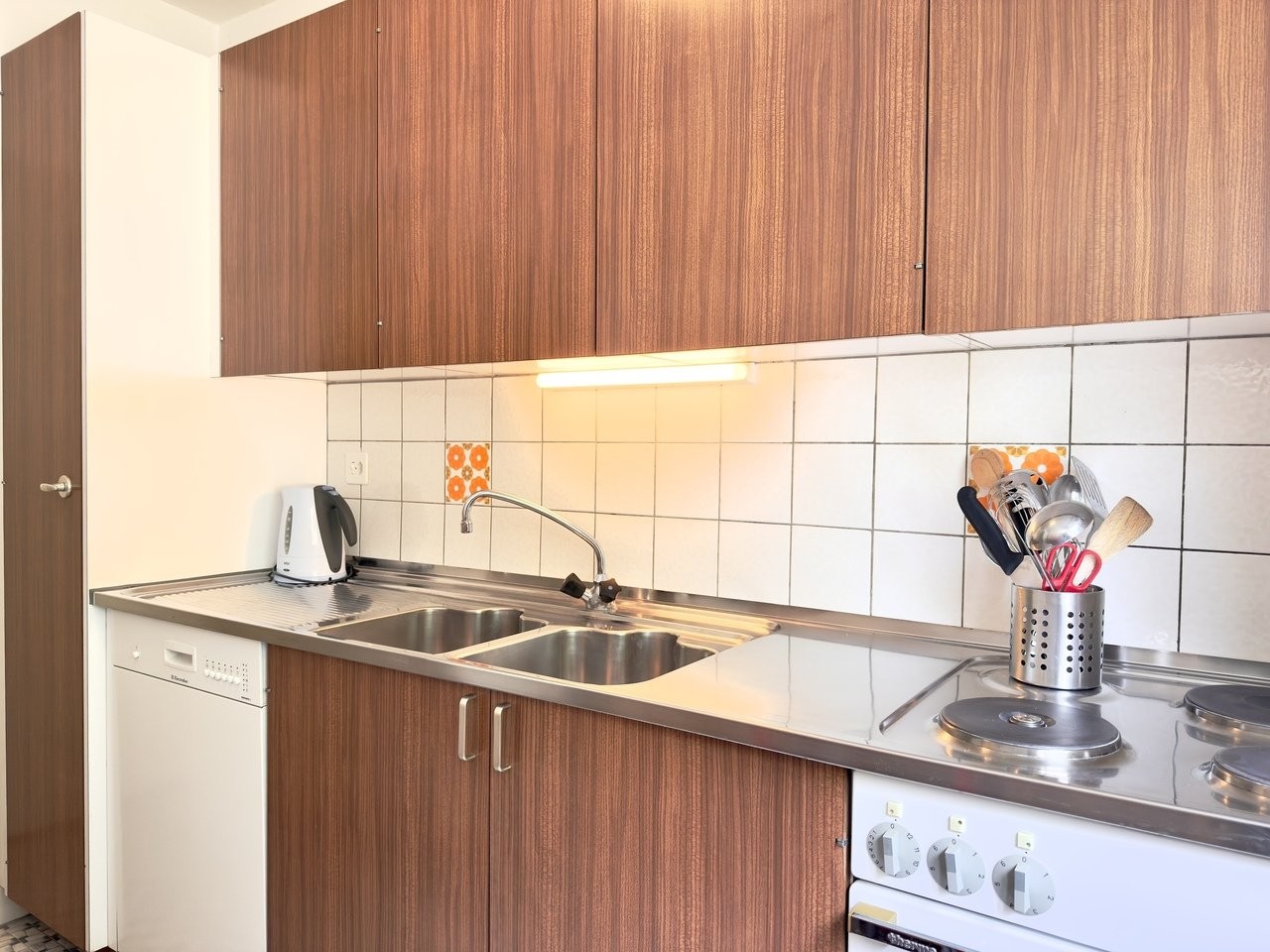 1 cuisine équipée avec lave vaisselle et réfrigérateur.