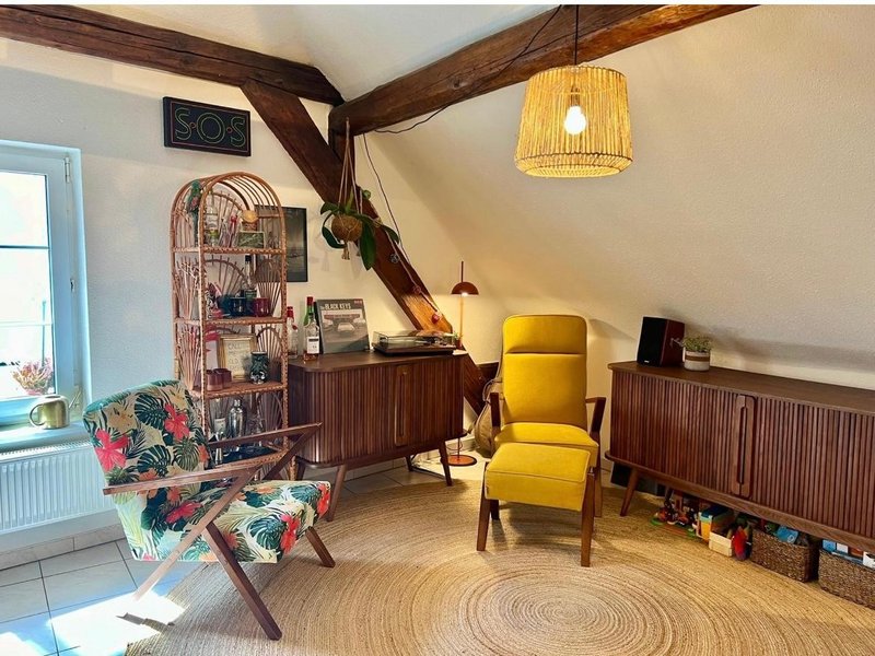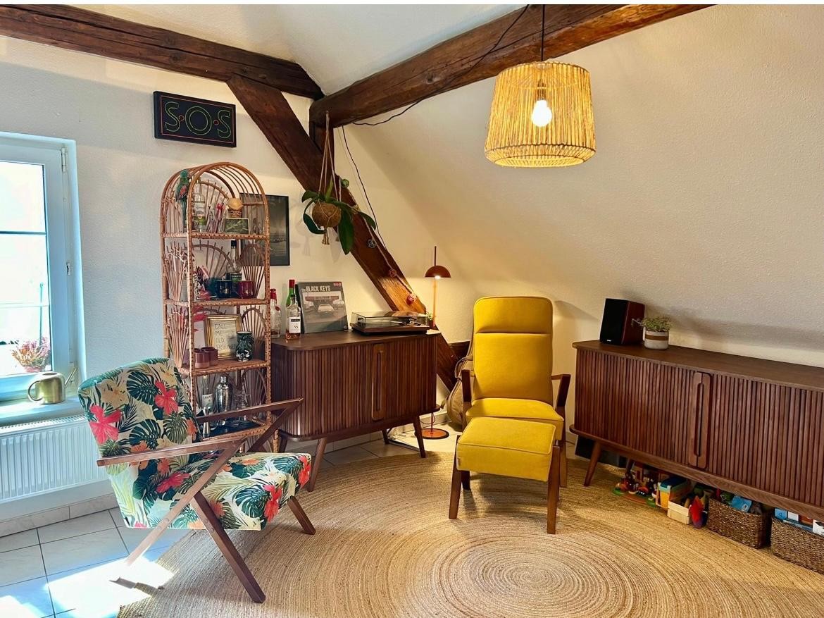 Espace de vie : Cuisine ouverte et grand séjour avec belle hauteur sous plafond.