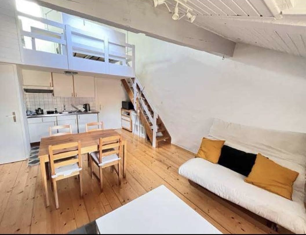 Caractéristiques de l’appartement • Salon lumineux et meublé : canapé, bureau, table à manger, étagères • Jolie mezzanine avec lit double et accès direct à la salle de bain • Cuisine fonctionnelle avec plaques, rangements et lumière naturelle • Plancher en bois & poutres apparentes pour une ambiance chaleureuse • Situé sous les toits : calme, lumineux et très cosy • À quelques minutes des universités, commerces, cafés, bus et lieux de sortie