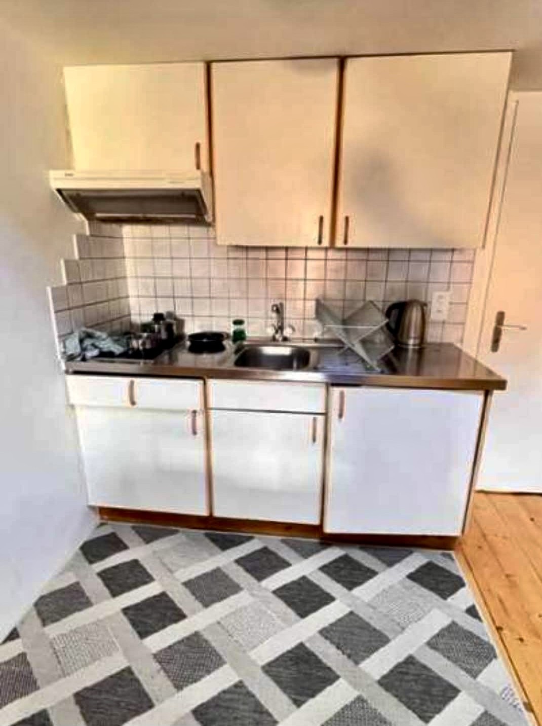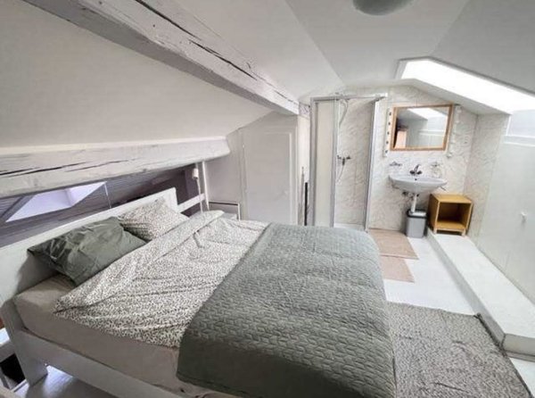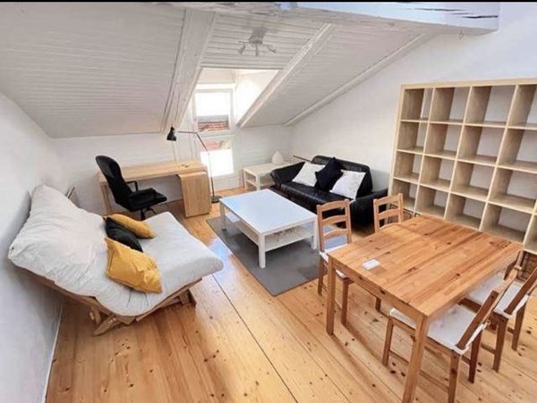 Apartment Features • Fully furnished bright living area with sofa, desk, dining table & bookshelf • Spacious mezzanine sleeping area with a cozy double bed • Private bathroom directly connected to the bedroom • Functional kitchen with stove, storage and natural light • Warm wooden floors & charming attic beams • Top-floor unit — quiet, calm, and full of natural light • Walking distance to universities, shops, cafés, bus stops & nightlife