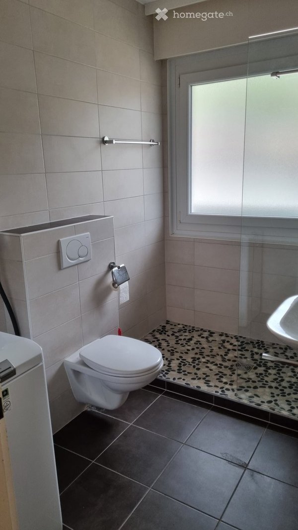 Salle de bain moderne : Avec toilettes, douche italienne, lavabo, sol carrelé et machine à laver privée