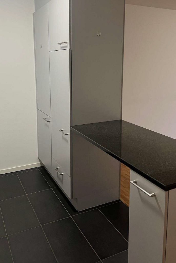 - Küche und Nasszellen mit pflegeleichtem, dunklem Plattenboden