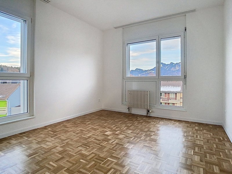 Grand séjour lumineux avec une hauteur sous plafond généreuse offrant une superbe vue dégagée sur le Moléson