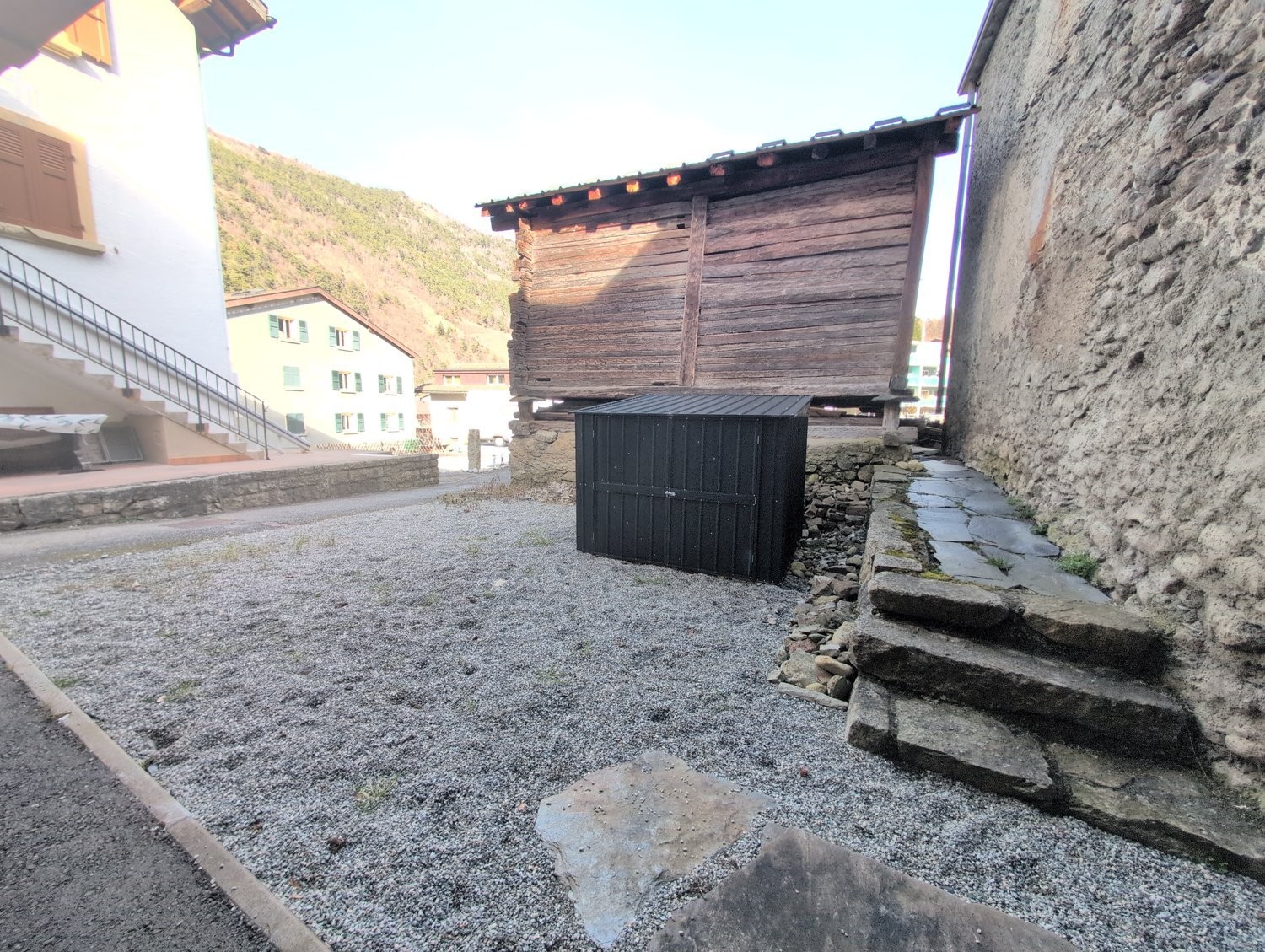 Espace extérieur en gravier avec petit container de rangement