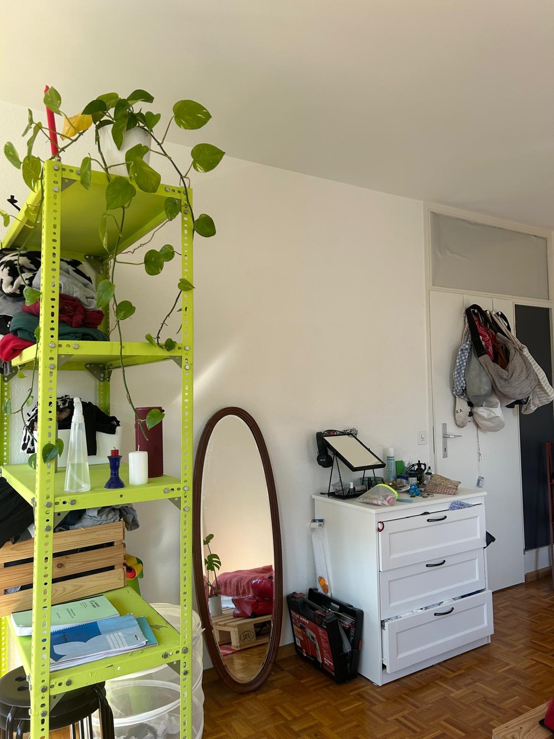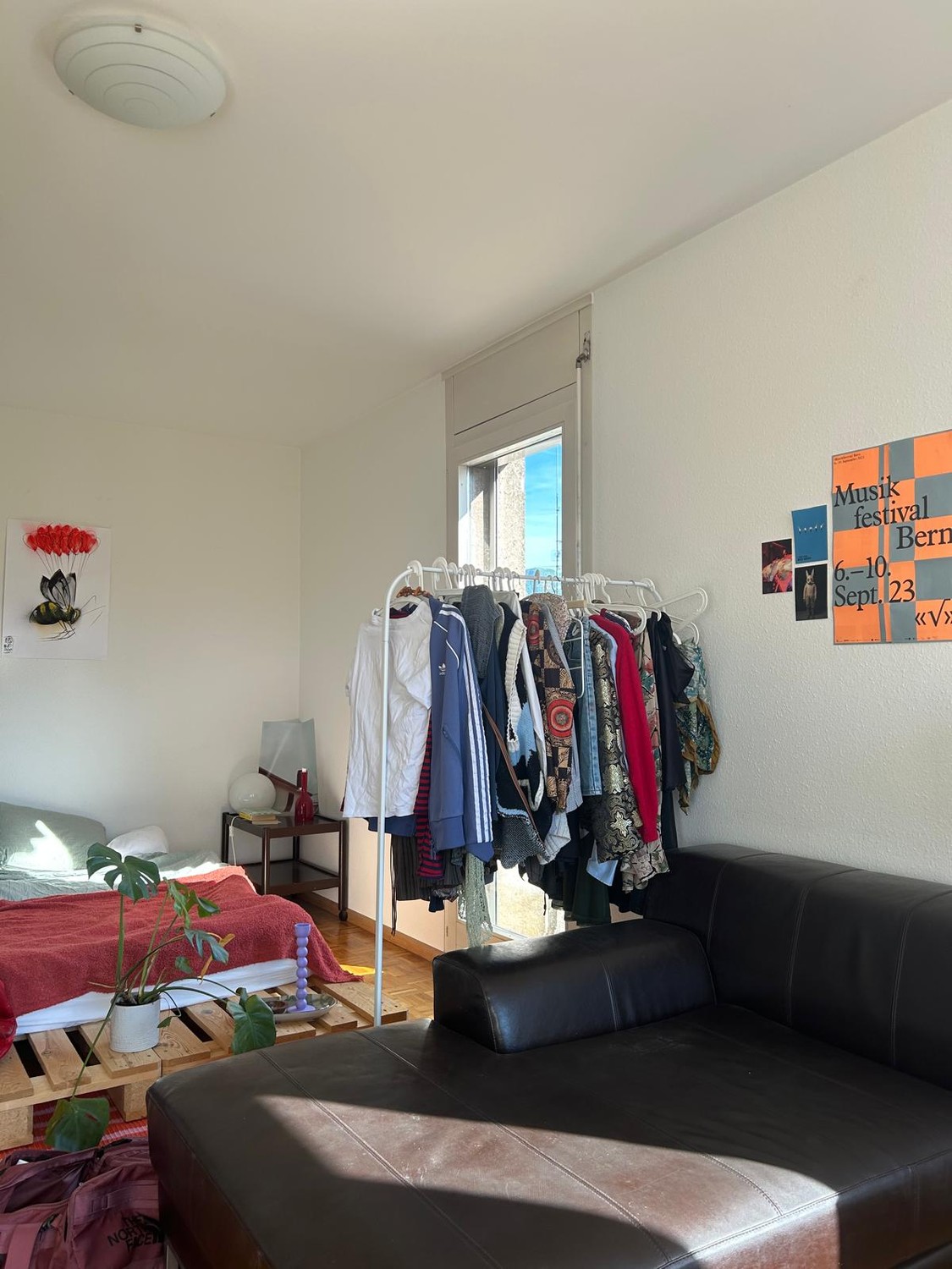 The apartment is about 90 square meters with an entrance hall, a fully equipped kitchen, a separate toilet, and a separate bathroom. There is no living room, but the kitchen has a large table where everyone hangs out. And as you might have seen on the pictures, my room has a sofa. The room comes furnished with my furniture, but you’re welcome to bring anything additional you need. The flat has everything: a dishwasher, free laundry facilities in the building (which almost nobody else uses!), as well as a cellar and a bike storage room. The rent covers everything except electricity, which typically costs around 10 CHF per month.