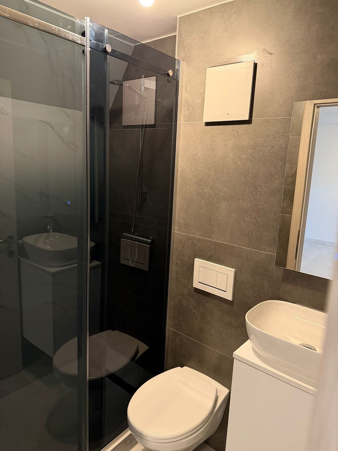 Cuisine ouverte sur le séjour, salle-de-bains avec WC et colonne de lavage, douche avec WC, réduit et 2 chambres.