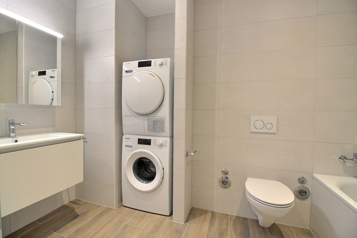 Deux salles d’eau : une salle de bain avec colonne de lavage intégrée et une salle de douche séparée