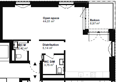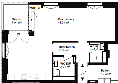Aménagement complet : cuisinette, armoire, séparation, WC et balcon
